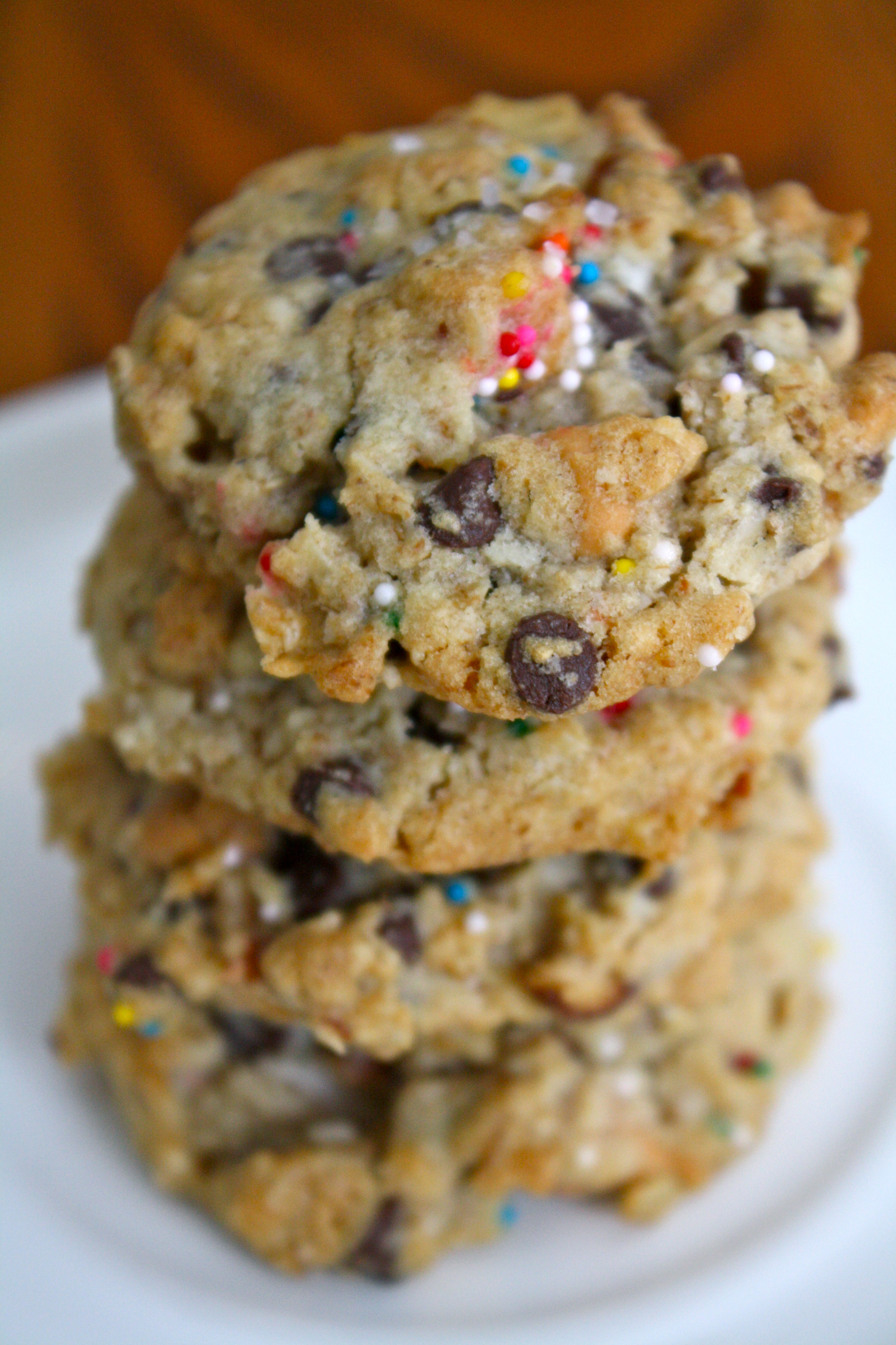 The beautiful thing about this recipe is that you can adjust it to your own liking. I’ve heard of people putting crushed potato chips into their cookies, which would be great. Or you could change the color of your sprinkles to match the season! Just try and keep the amount of additions you put in roughly the same amount I used. Any more than that would cause the cookie dough to be too crumbly to stay together once out of the oven. Believe me. π