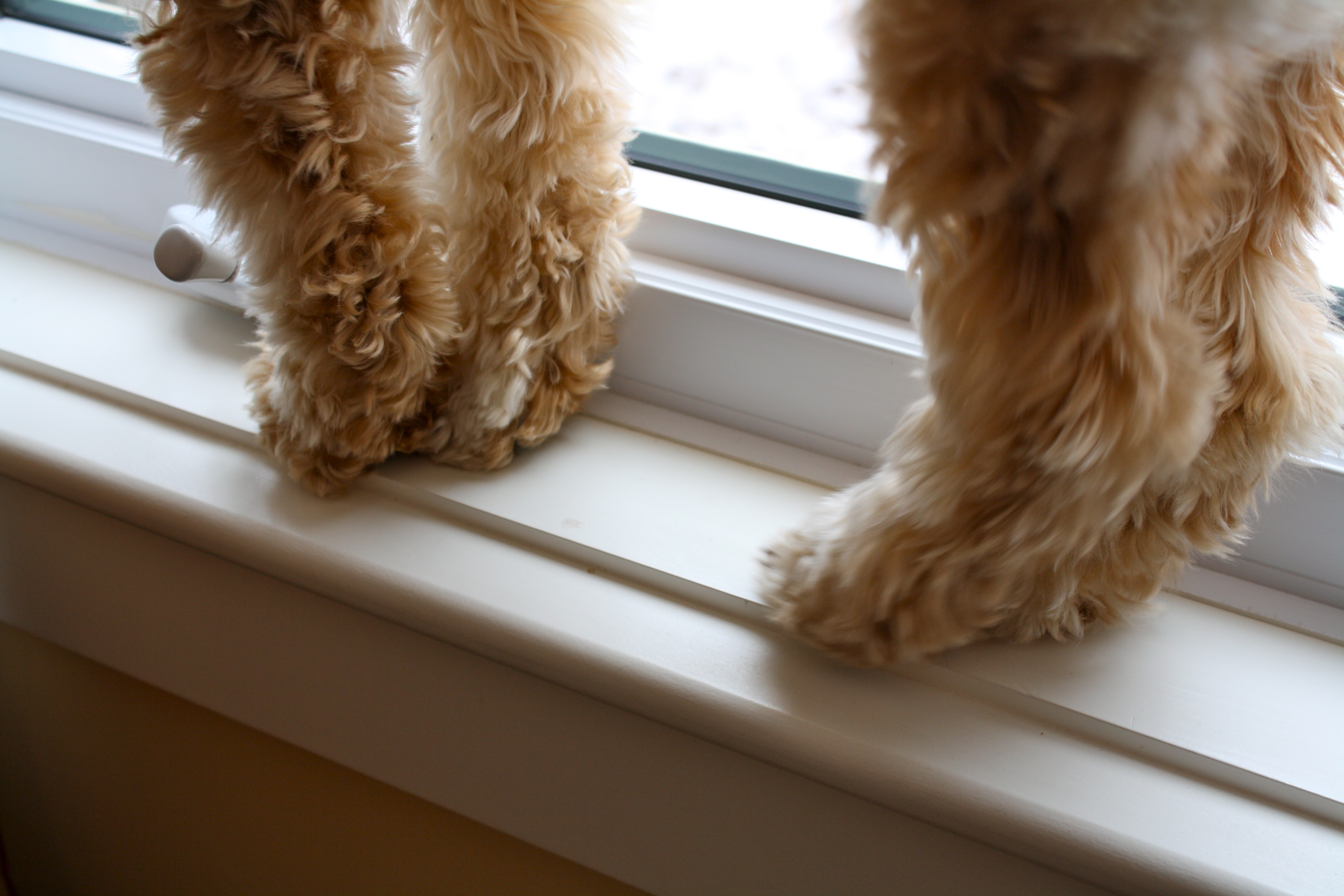 Or up here. On the three inch-thick window sill. That’s taller than she is. She’ll do two or three practice lunges before jumping up.