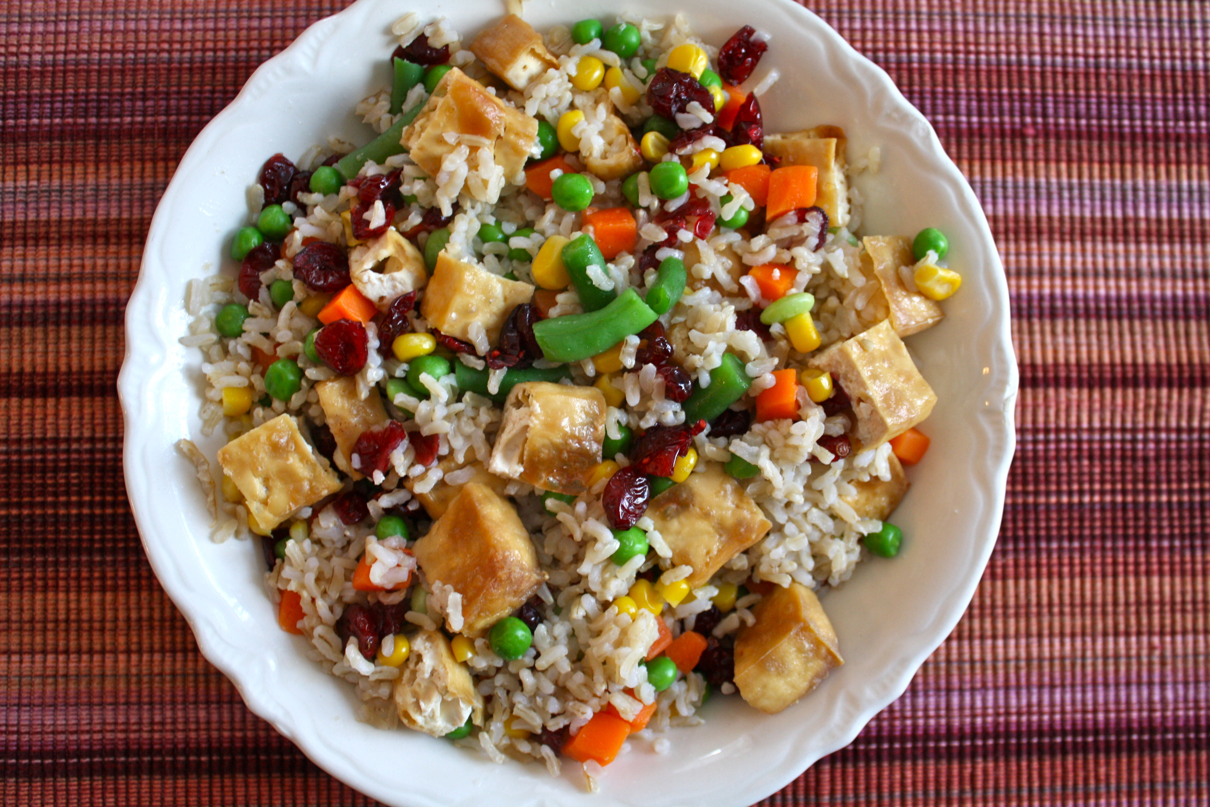 Brown rice, mixed veggies, Craisins, and baked tofu. Ohmygosh it was so good.