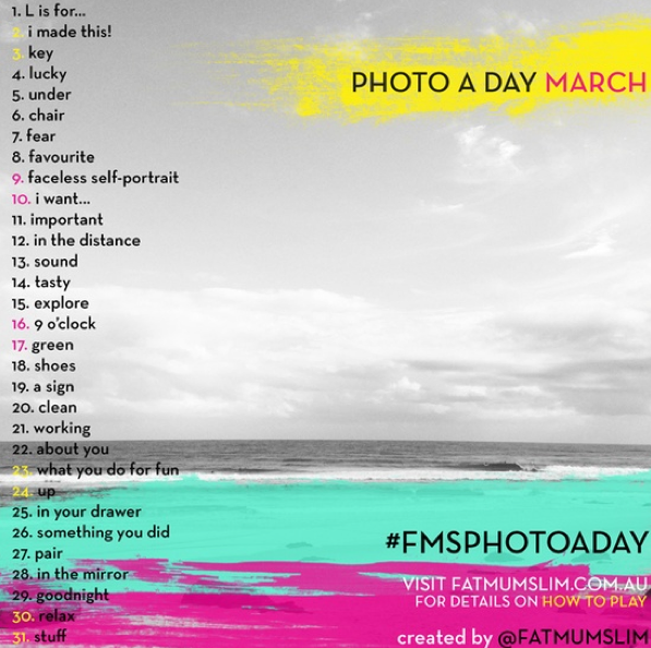 I’ve seen this sort of project around the blogosphere for a while, but I’d never participated in it. After simply googling “a photo a day” I came upon this graphic from fatmumslim.com.au, and decided to give it a try!