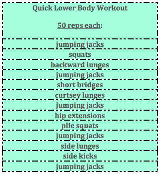 I wanted to stop by and share a quick, killer lower body workout I came up with the other day. It’s great paired with some cardio, such as running or a while on the elliptical trainer, but is perfectly good on it’s own if you’re low on time. I was definitely sweating by the time I was done!