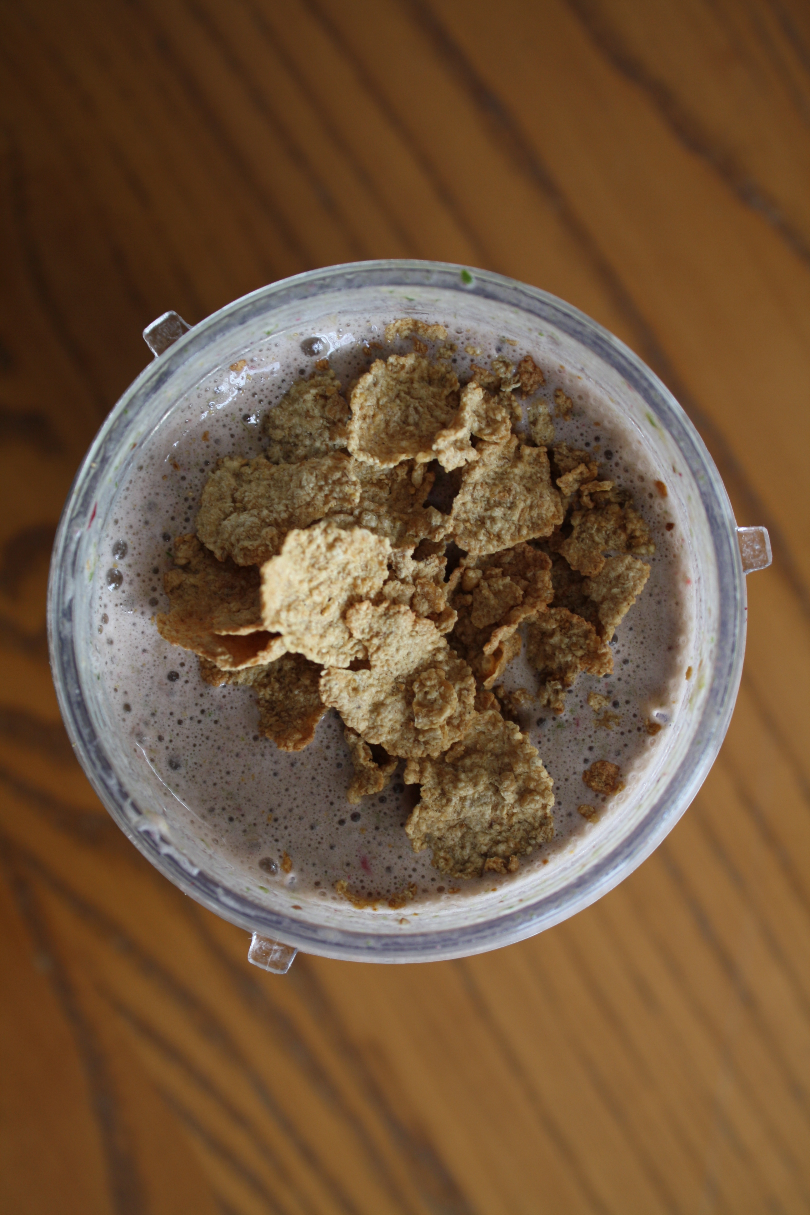 So then I added about 1/2 cup mixed berries, and ended up with this weird purpley color. I topped the smoothie with some Special K Protein cereal, and voila! Delicious.