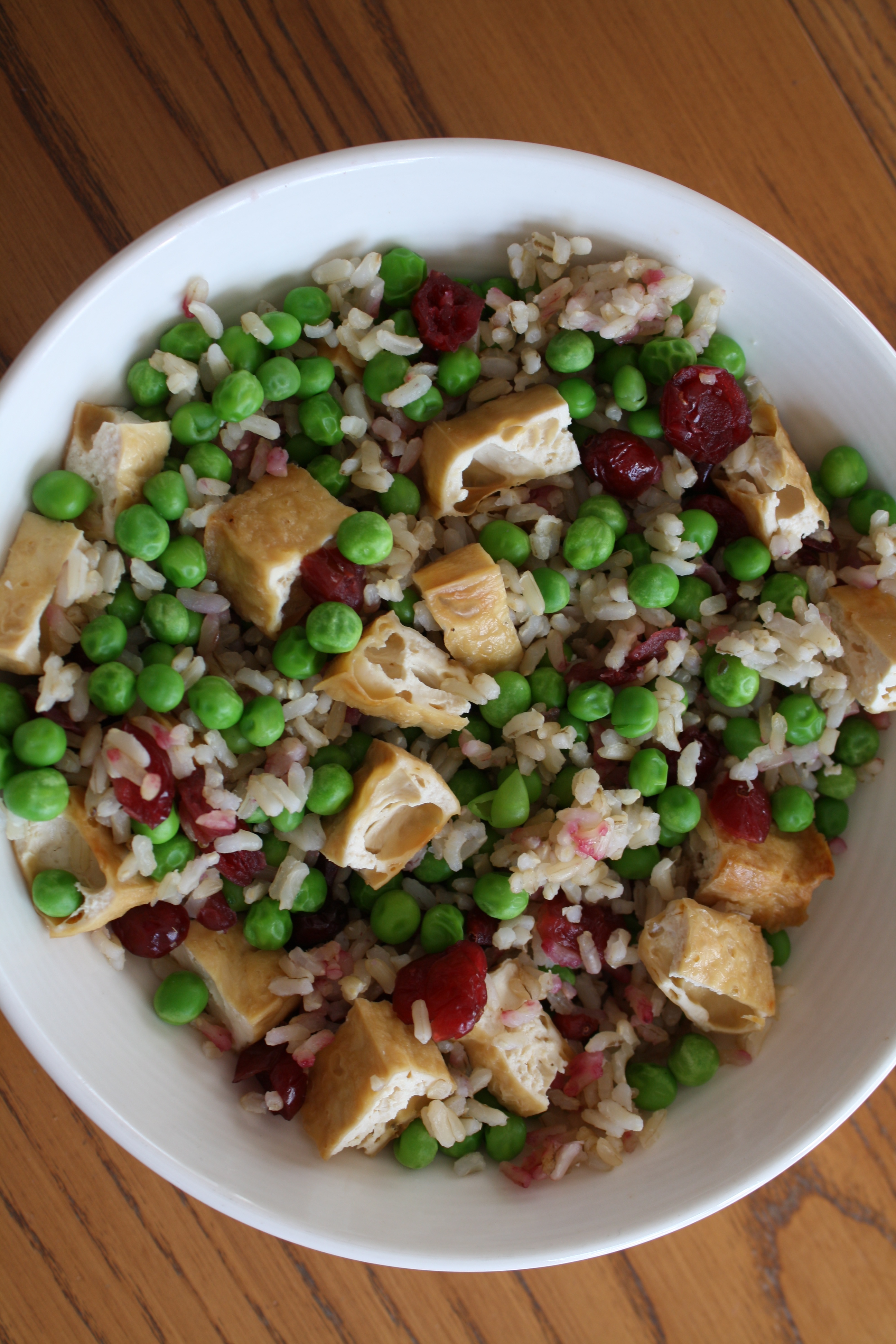 One super delicious and filling lunch I enjoyed last week was this bowl of tofu, rice, Craisins, and peas.