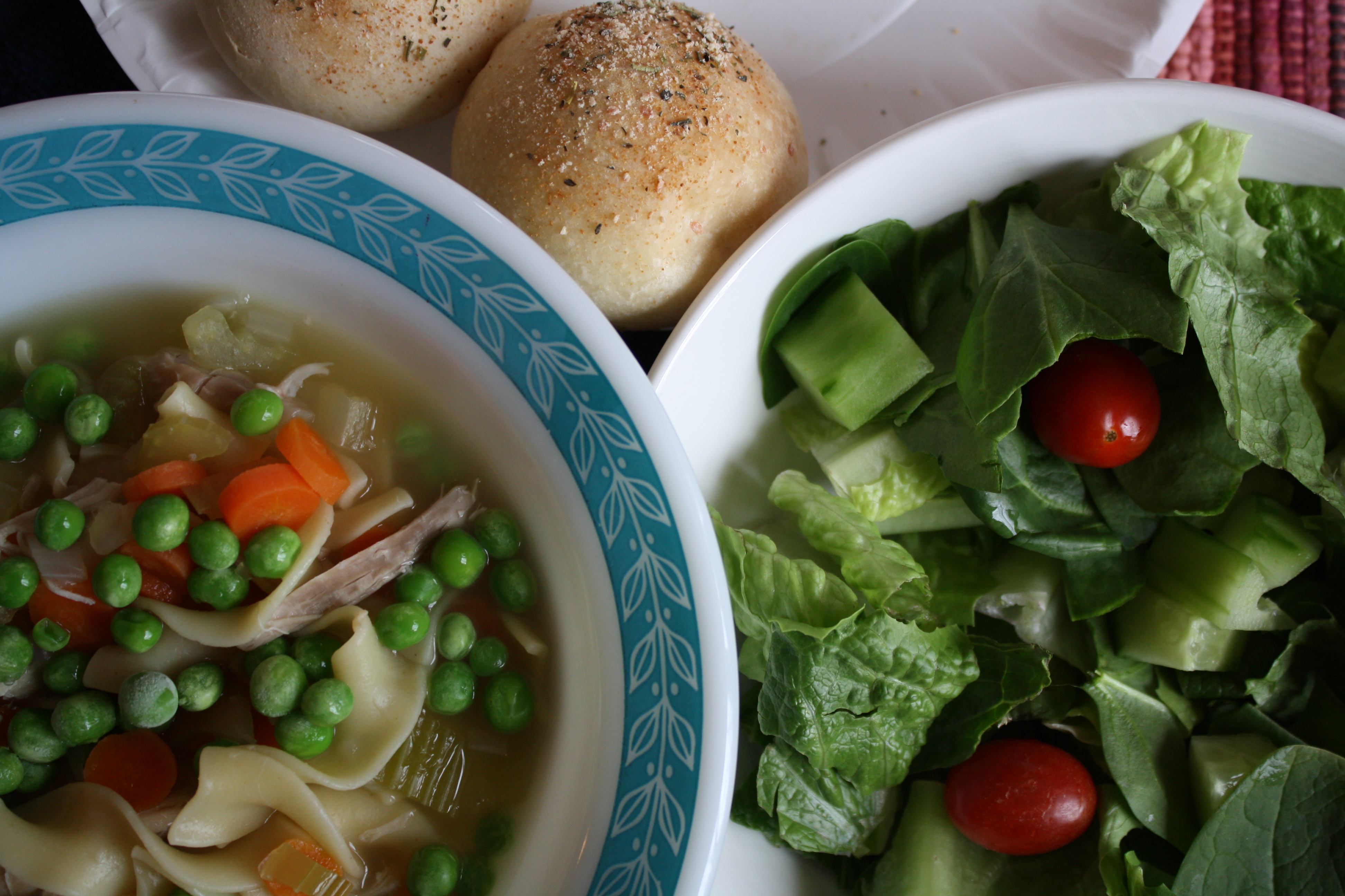 Then on Saturday, my mom and I made soup, salad, and bread sticks rolls. Chicken noodle soup and frozen dinner rolls dipped in butter and sprinkled with herbs. Drool.