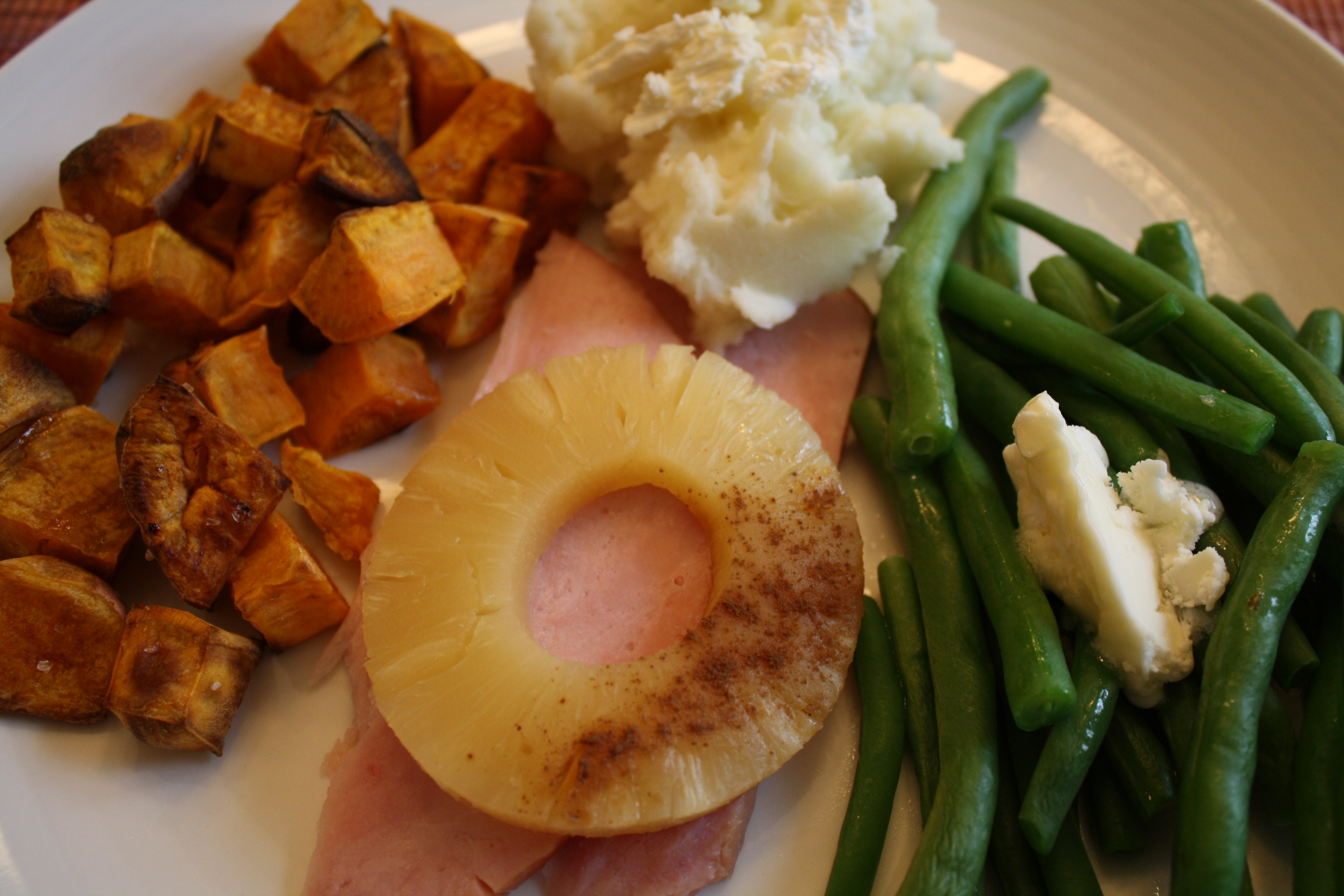 On the side there were roasted sweet potatoes, mashed potatoes, and green beans.