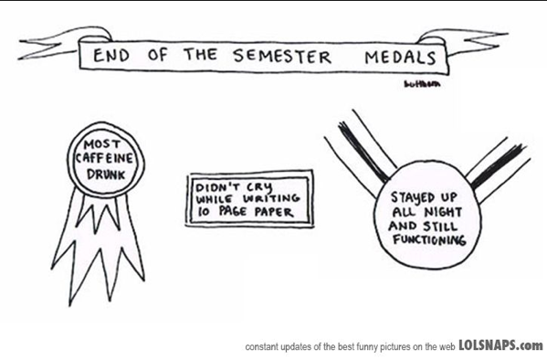 Cracking up at the drawing of those medals. Congrats on being done with classes. Good luck with finals!!