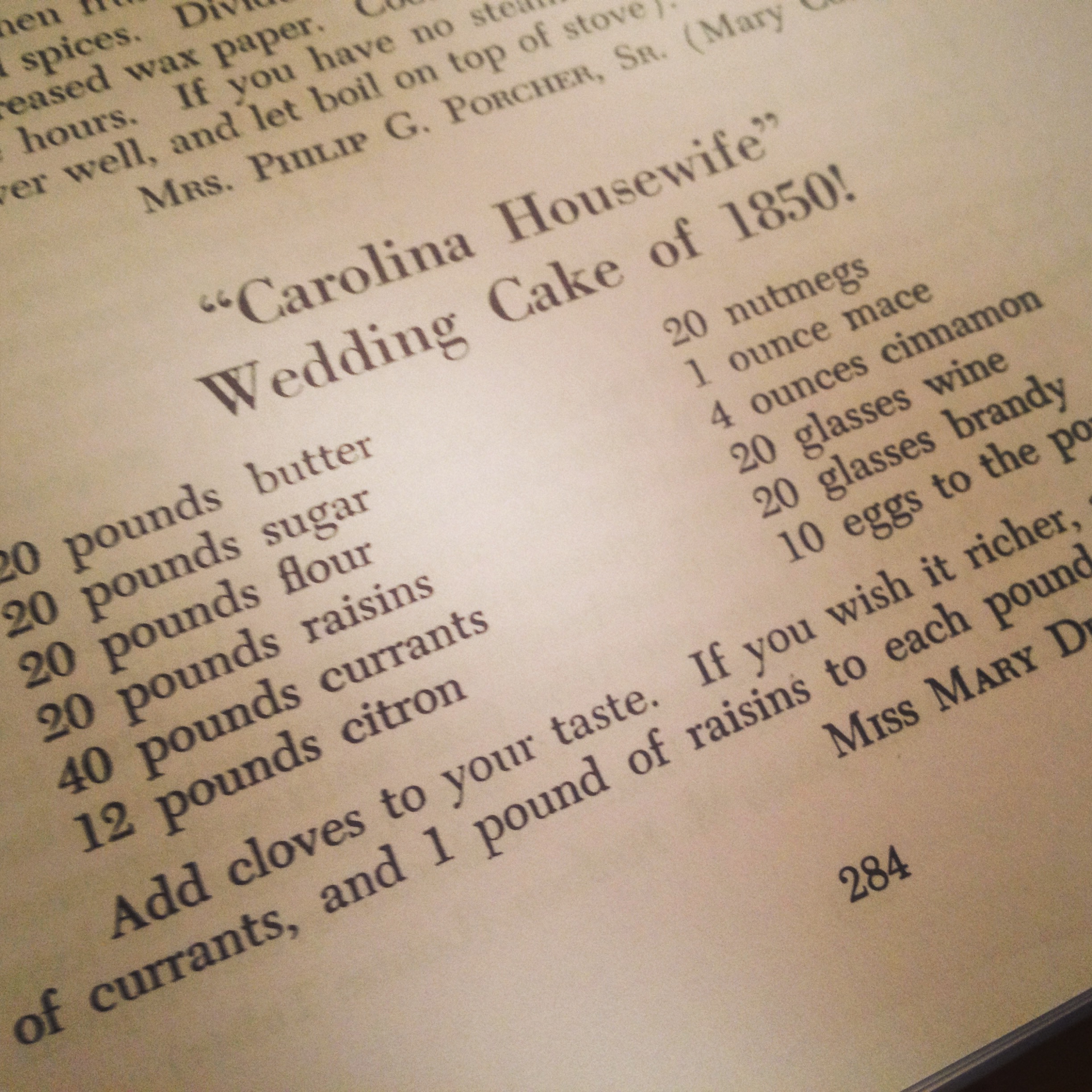 photoIf you follow me on Instagram, you’ll have already seen this, but I just had to share it again with the rest of you. It’s just amazing! I found it in a cookbook called “Carolina Receipts.” Apparently there have been issues of this book coming out since 1950, so a lot of the recipes are old and neat to look at. They’re little historical gems in the way they’re written and some of the phrases. I was flipping through it and stumbled across this one, which I’m guessing was maybe a wedding cake or church reception cake? From 1850? Whatever it was, it’s still very interesting!