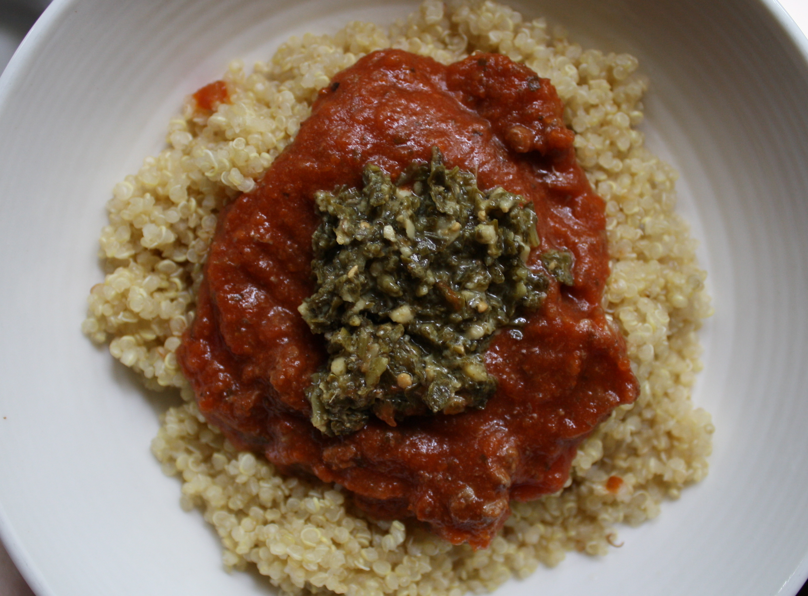 A bowl of cooked quinoa topped with some pasta sauce and pesto. YUM.