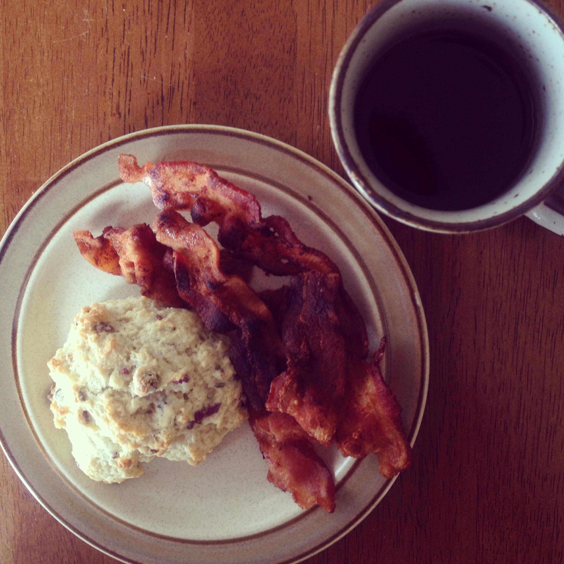 …Except for one of the days, during which I had two lovely, pillowy, freshly baked scones (courtesy of Trader Joe’s), extra crispy bacon, and coffee.
