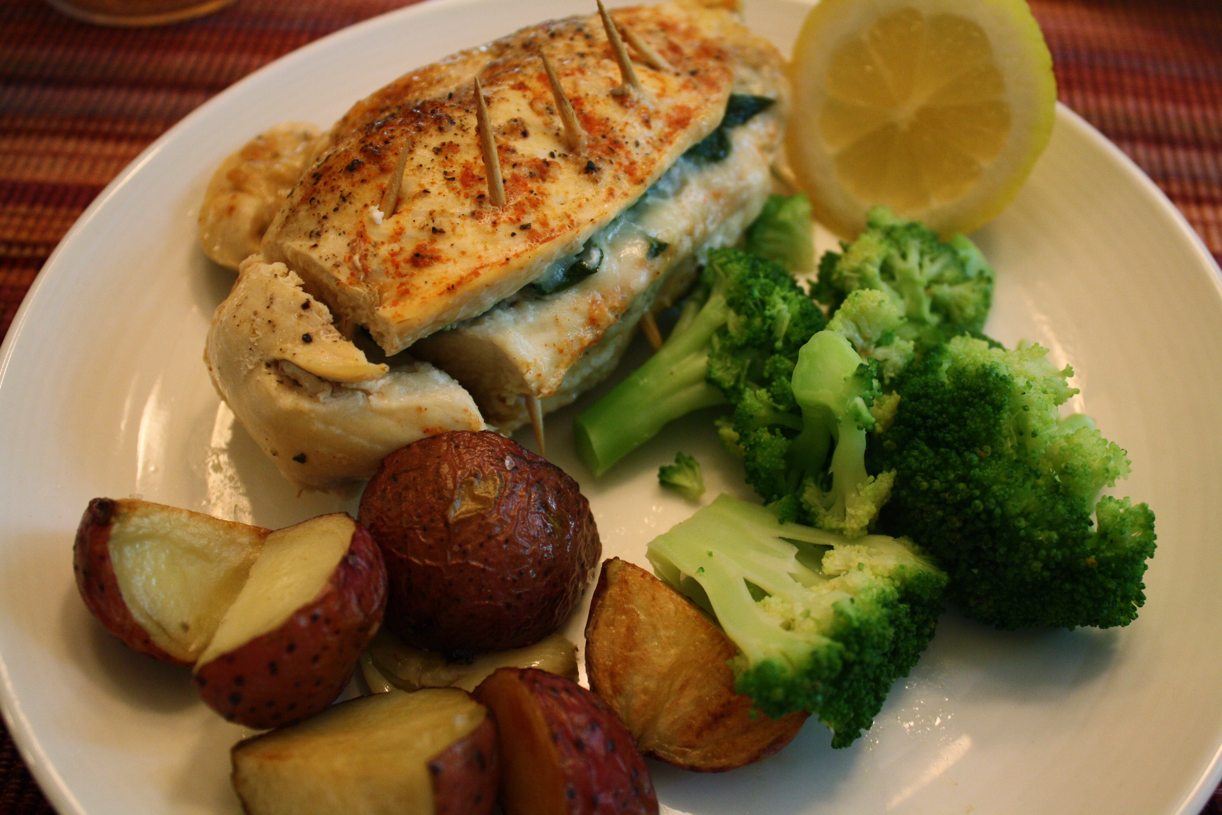 (Lemon is one of the worst things, but I figure squeezing some juice on top of the broccoli is better than topping it with cheese or butter. The chicken was stuffed with a bit of cheese and some spinach – hence the spikes. π )