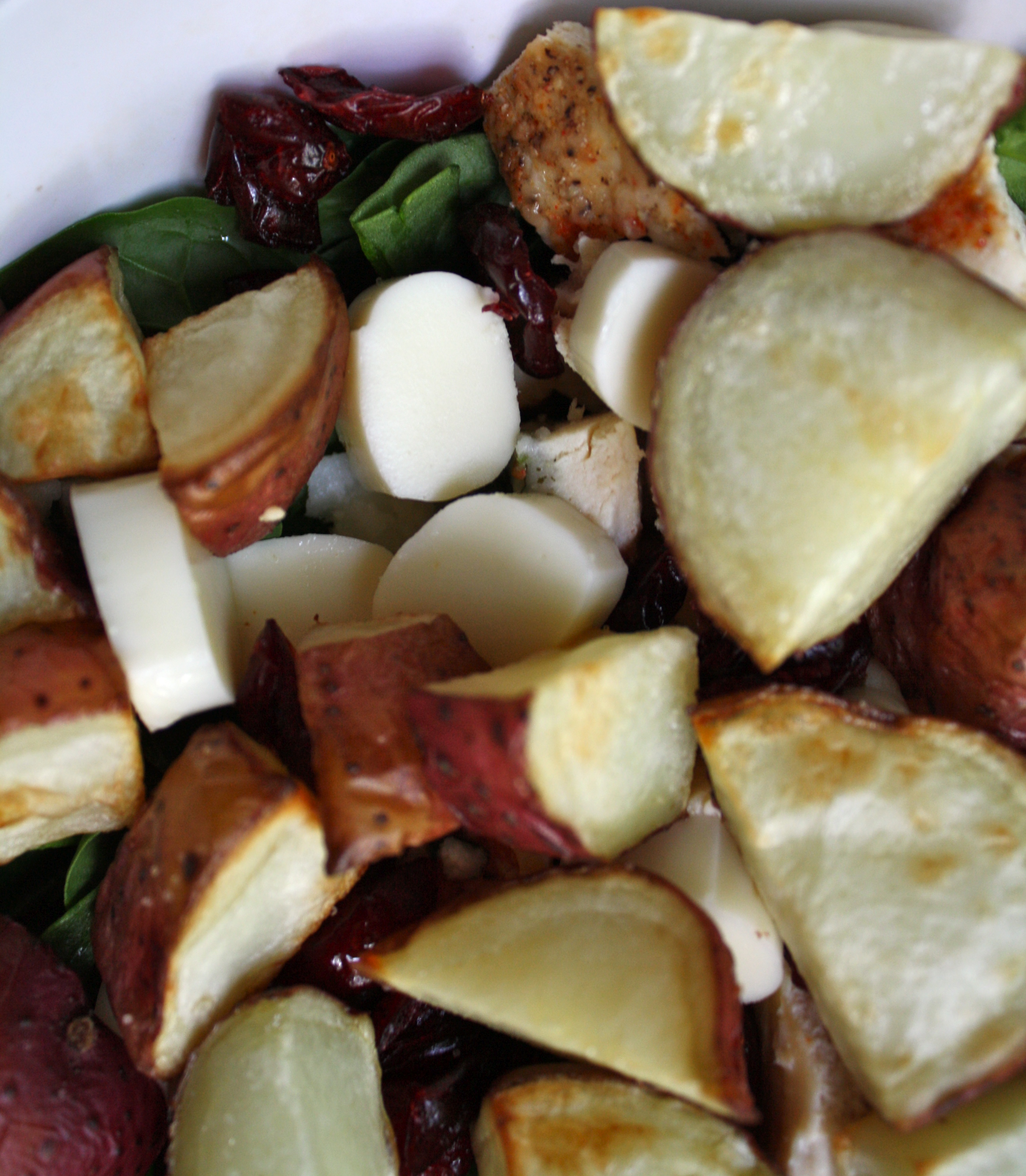 I also read that salads are good for low-acid diets. Raw, leafy greens are specifically recommended, so I’ve been trying to get a lot of those in lately. I’ve also been dolling my salads up with chicken, dried cranberries (not good for acid, but I find I need that sharp taste to break up the monotony), edamame, and even roasted potatoes. I’ve been trying not to include any vinegar/vinaigrette/dressing on them at all. You can see in this picture that I had been slicing up some string cheese, but I don’t think I’ll do that any more. The extra protein is nice, but again, I want to stay away from dairy as much as possible.