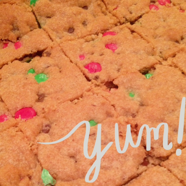 - I baked up some M&M and chocolate chip cookie bars for our staff potluck. I didn’t get a chance to get a good picture, but boy oh boy were they good. If I decide to make them again, I’ll post the recipe. They couldn’t have been easier!