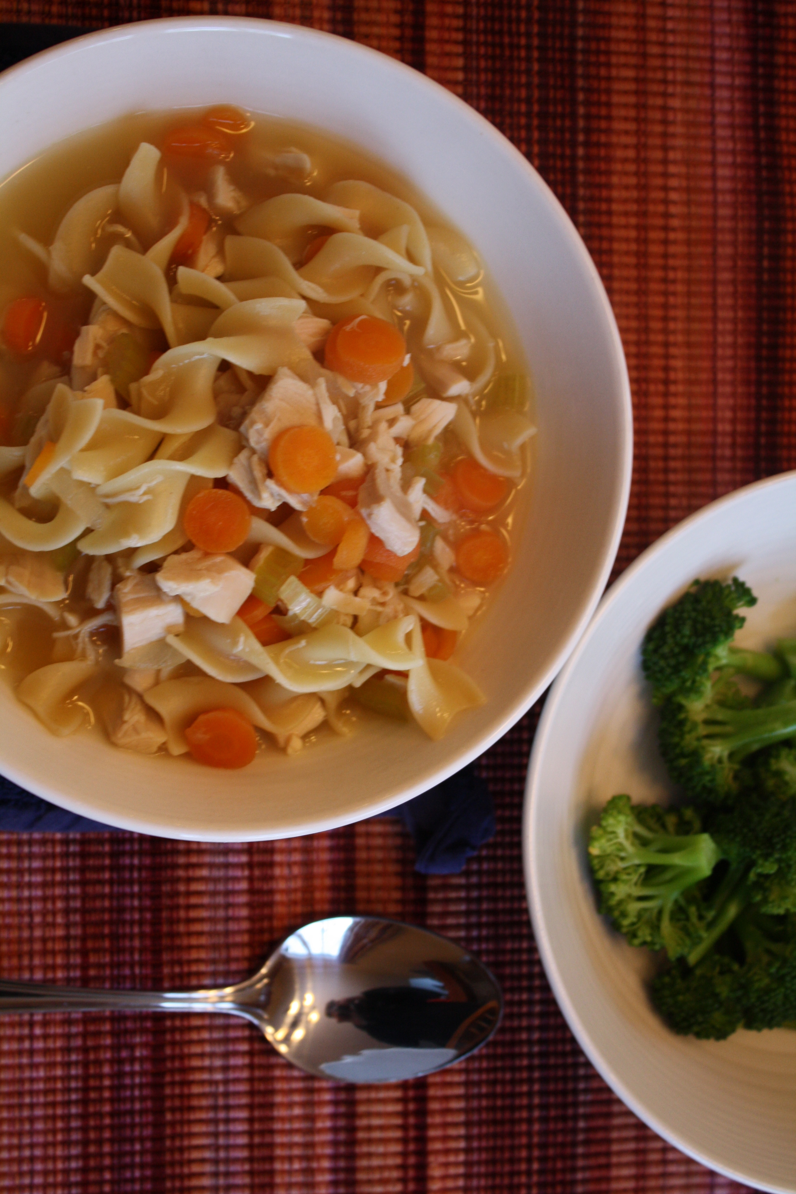 soupandbroccoliChicken noodle soup and a side of broccoli.