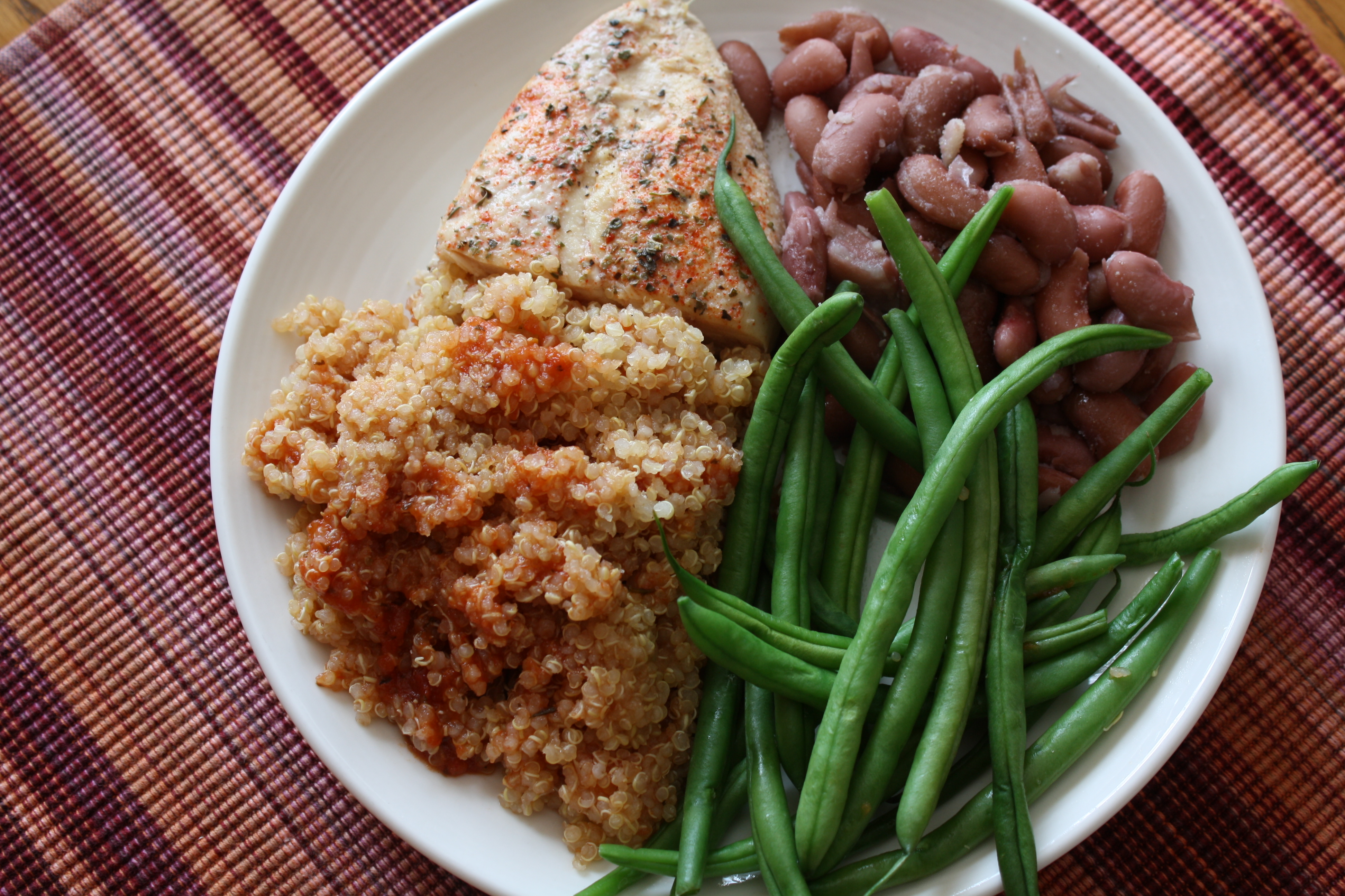 Quinoa with pasta sauce, green beans, kidney beans, and chicken.