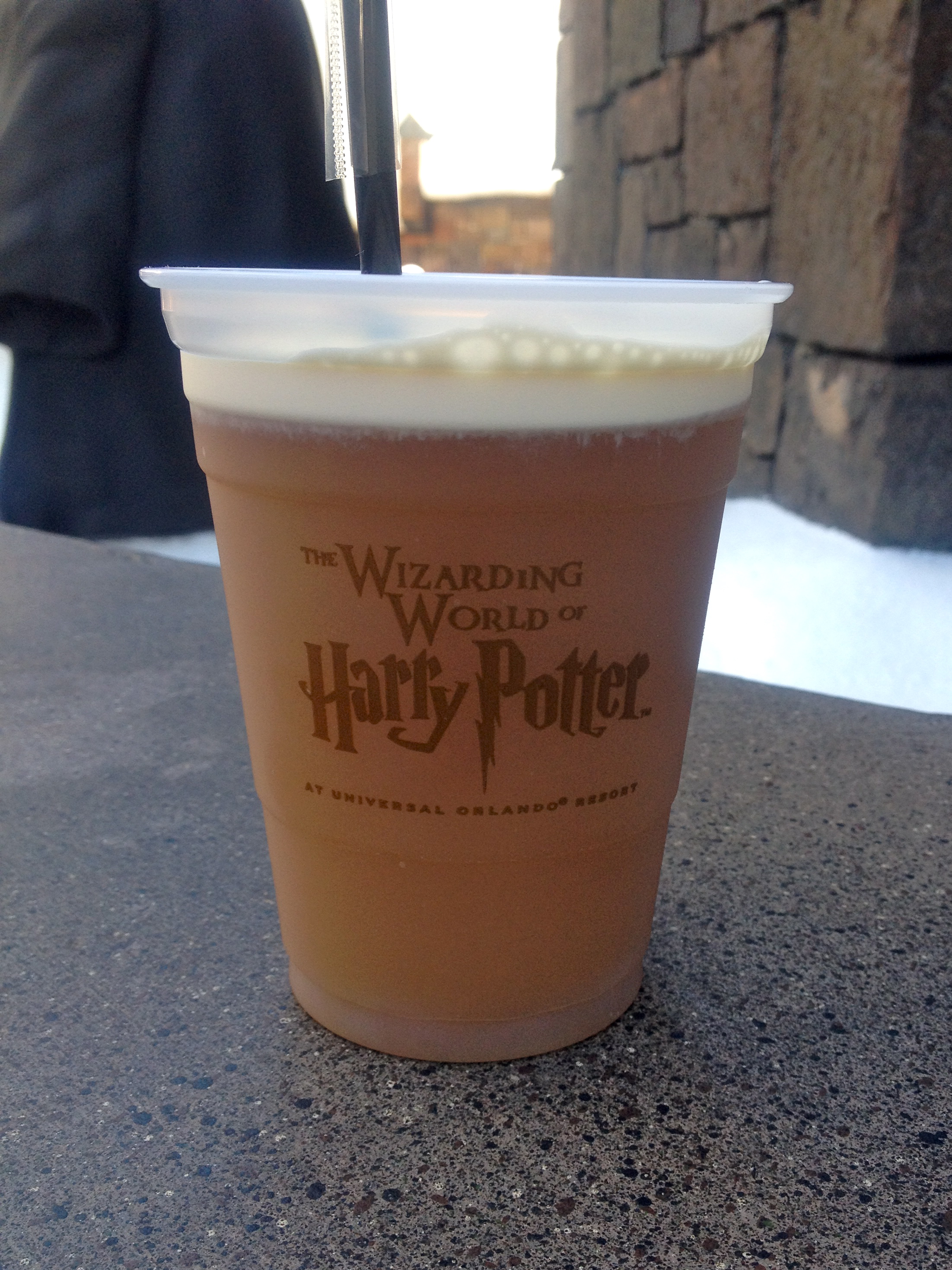 photo 2-1Butterbeer has the taste of butterscotch, but is very creamy – the white foam on top is like a vanilla creamsicle. It is suuuuuper sweet. I actually couldn’t finish the whole thing because of that, but it was definitely worth every penny and calorie for the experience! πŸ™‚