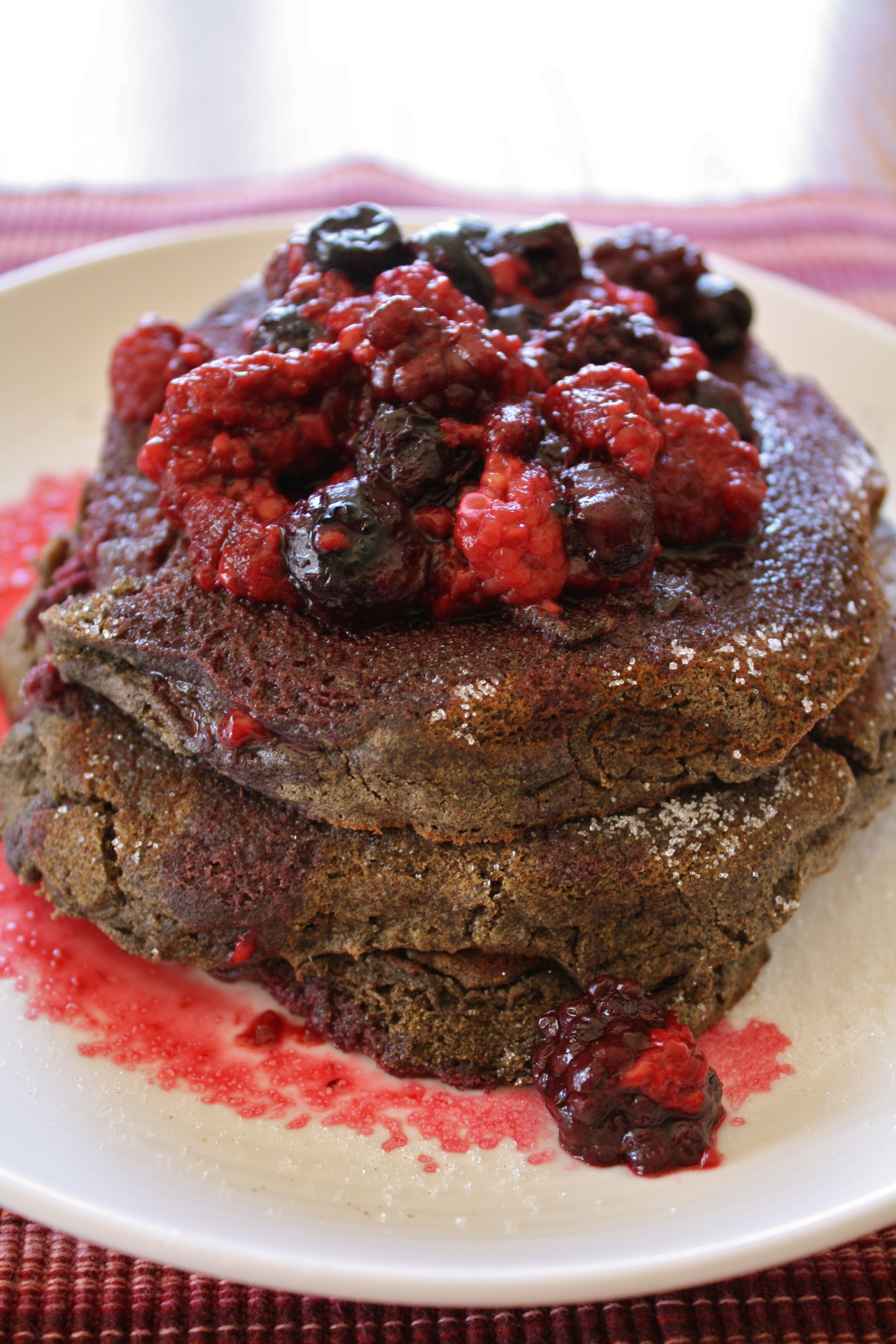 Here’s how I serve my pancakes: I top them all with margarine or butter, and sprinkle sugar over the top. Then I stack them, pour over the berries and juice, and enjoy! I did notice that because the texture was a bit dry (because of the buckwheat flour), I needed to add syrup to the stack, but that’s nothing to complain about!